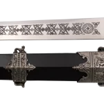 diciembre 18, 2024Daga S0174 Medieval, El pomo es de color niquel con un brillante en rojo, la guarda es de color niquel con la empuñadura en negro. El tamaño total es de 39cm con la hoja de acero. La vaina es negra con acabados en color niquel. Ref. S0174