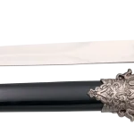 Daga 16643 Templarios, el pomo, la guarda y la empuñadura son de color niquel con dibujos. El tamaño total es de 35cm con la hoja de acero. La vaina es de color negro con acabados en color niquel. Ref. 16443