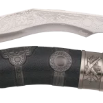 Daga 31085 Kukri o khukuri nepalí, el pomo y empuñadura es de color niquel. El tamaño total es de 38.5cm con la hoja de acero en forma de curva con detalles grabados. La vaina es de cuero con acabados metálicos. Ref. 31085