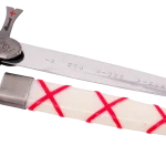 Daga S0213WB Diseño exclusivo Priorato de Sion, el pomo tiene forma de casco en color niquel con detalles en rojo, la guarda contiene un pequeño escudo en color niquel con acabados en rojo y la empuñadura en color marfil con un dibujo de un templario. El tamaño total es de 39.5cm de hoja de acero grabada. La vaina es de color marfil con acabados en color niquel y franjas cruzadas en rojo. Ref. S0213WB