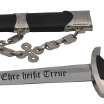 Daga 14263, el pomo y la guarda son de color niquel con la empuñadura en color negro con un dibujo de un águila. El tamaño total es de 39.5cm de hoja en acero con una escritura en la hoja. La vaina es de color negro con acabados en niquel y contiene una cadena . Ref. 14263