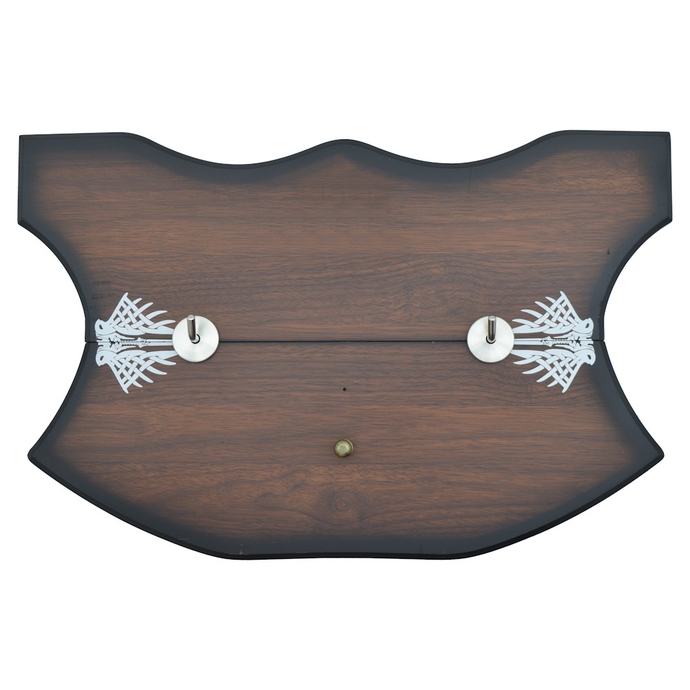 Hojas de acero. Empuñaduras de madera. Guarda y pomo metálicos. Incluye soporte de pared de madera.