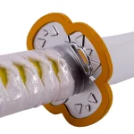 Katana Funcional S0244H de Demon Slayer empuñada por Agatsuma Zenitsu réplica no oficial de 108 cm hoja de acero al carbono AISI 1045 acabada en negro, con vaina blanca con engarces en color naranja, mango con encordado blanco e imitación de piel de raya de color naranja , con caja de madera forrada de tejido decorativo de presentación. Ref. S0244H