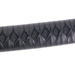 Katana S2023 de 101,5 cm hoja de acero, vaina de madera negra lacada con detalles metálicos e imitación de piel de serpiente, mango con imitación de piel de sepriente negra de polipiel. Con soporte. Ref. S2023