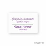 Tarjeta precortada Grazie per condividere….texto lila y verde 5×3,5cm.